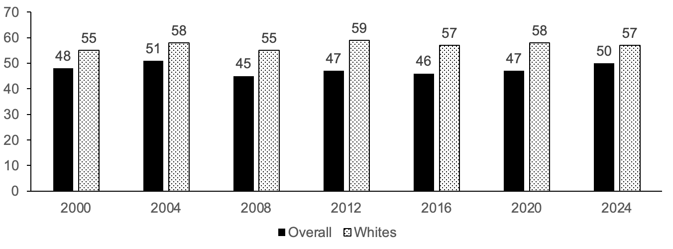 One clue comes from presidential vote shares in the 21st century. In the figure below, I have charted the overall Republican vote share and the Republican vote share among whites in each presidential election since 2000. There is clearly a lot of stability from election to election — presidential elections tend to be pretty close in this era. However, we see something very interesting about the 2012 election. That election saw the biggest rise — four percentage points — in the Republican presidential vote among whites from the previous election in the whole time series. The white vote share went from 55 percent to 59 percent between 2008 and 2012, while it dropped back down to 57 percent in 2016. The 2012 election also sees the biggest gap between the white vote share and the vote share of the rest of the country; whites voted 12 percentage points more Republican than the nation as a whole that year. That was only a 7-percentage point gap in 2024.