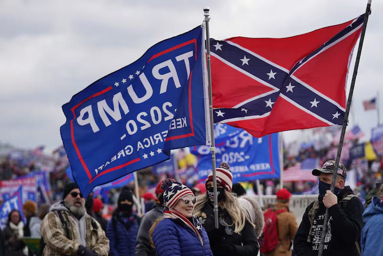 Similarly, the 2017 Unite the Right Rally in Charlottesville, Virginia — organized as a protest against the removal of a Confederate statue — featured Confederate battle flags; Trump famously defended the white supremacist demonstrators. Those resisting Covid restrictions in Michigan carried both Confederate and Trump flags.