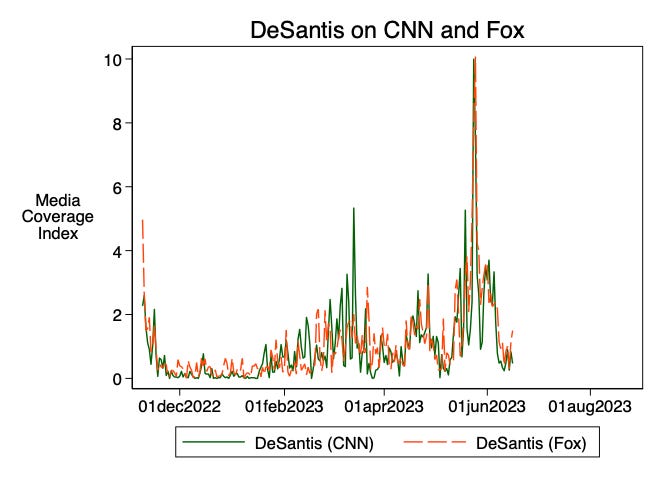 What about DeSantis? Actually, the levels of coverage are almost identical across networks, with CNN coverage just a non-significant 0.1 percent greater than Fox News coverage.