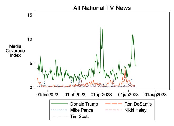 The figure below shows the percentage of news coverage for the top five Republican presidential candidates (in terms of coverage) in all available national TV news sources each day since the 2022 midterm elections. Not surprisingly, Trump completely dominates coverage, and had two particular spikes — his indictment in Manhattan in early April and his federal indictment in early June. Ron DeSantis is clearly in a distant second place for coverage but roughly matched Trump’s coverage on May 24th, the day he announced for president.