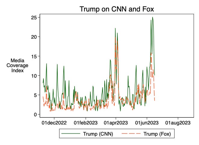 Trump has, of course, frequently called CNN “fake news” and suggested that they owe any financial successes to covering him. It’s hard to know just from these charts what the reason for the difference in Trump coverage is. It could be, as we’ve learned about CNN, recently-ousted CEO Chris Licht was seeking a more conservative audience, possible with greater Trump coverage. Conversely, we could interpret this as Fox News under-covering Trump in an era with a lot of bad news being generated about him.