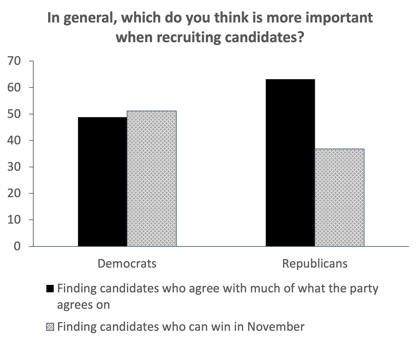 Are the parties really treating this question differently? To get at this, I conducted a survey of county party chairs in early February 2023. One of the questions I asked them was what sort of candidate they generally prefer to nominate: one who agrees with much of what the party agrees on, or one who can win a general election.
