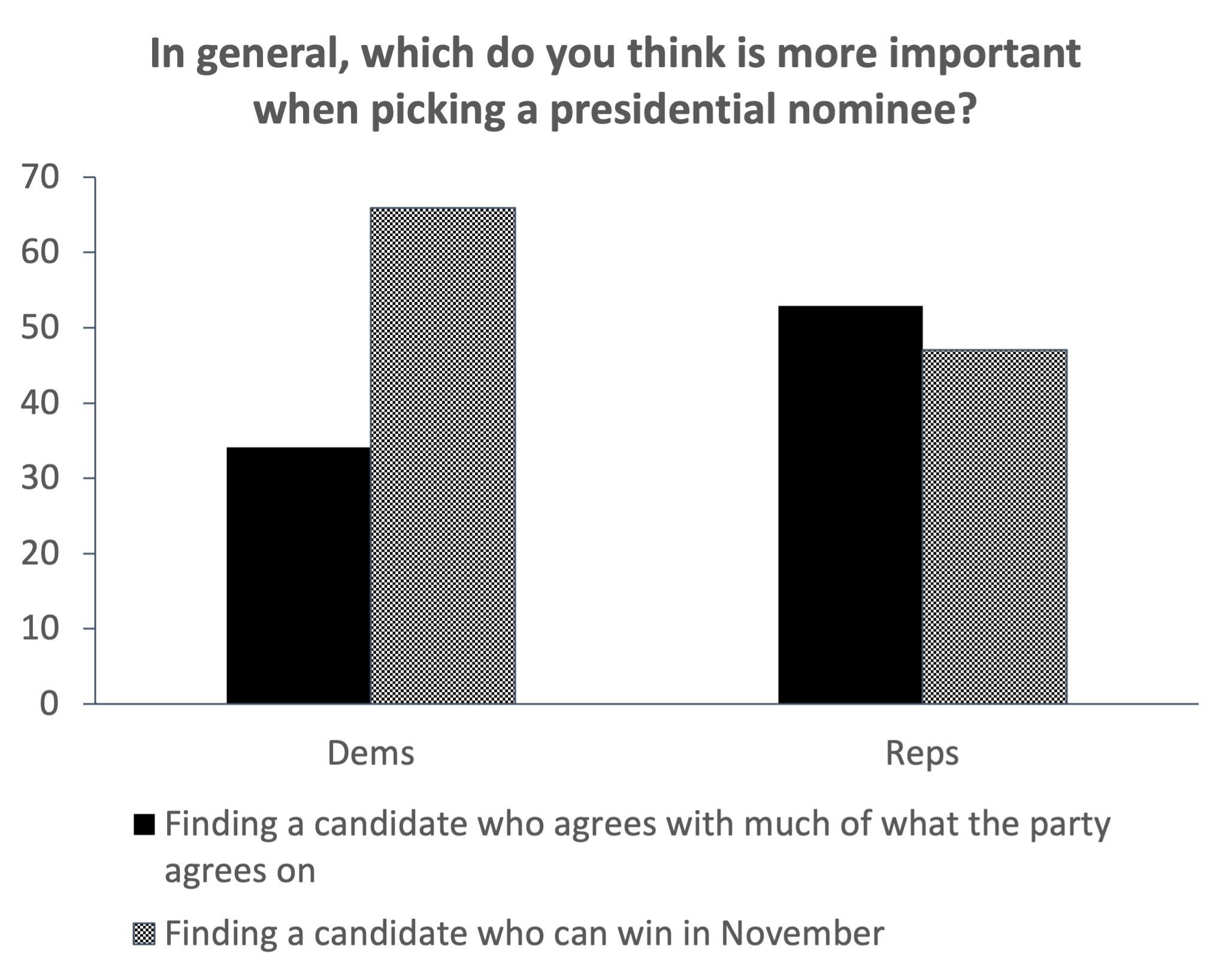 Democrats slightly preferred a candidate who can win over a candidate they agree with, by a factor of 51-49. Republicans, however, overwhelmingly preferred a candidate they agree with, by 63 to 37.