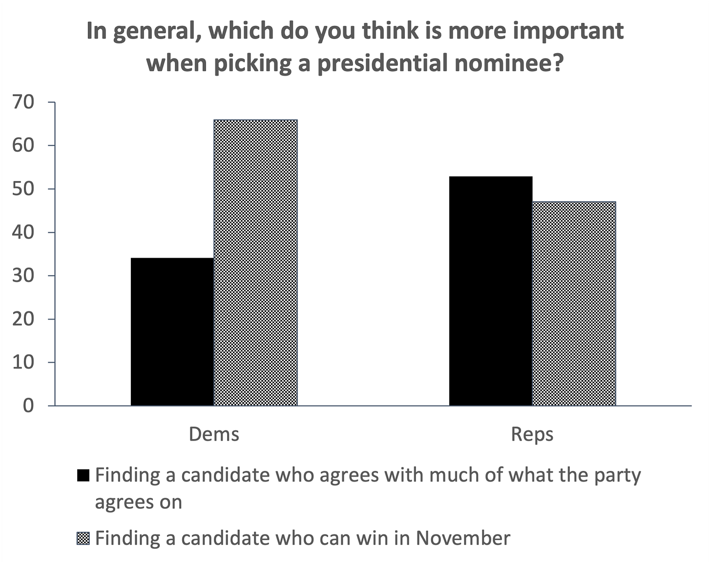 It’s the same basic pattern. Democrats in this case overwhelmingly prefer presidential nominees who they think can win (66-34), while Republicans narrowly prefer a candidate they agree with (53-47).