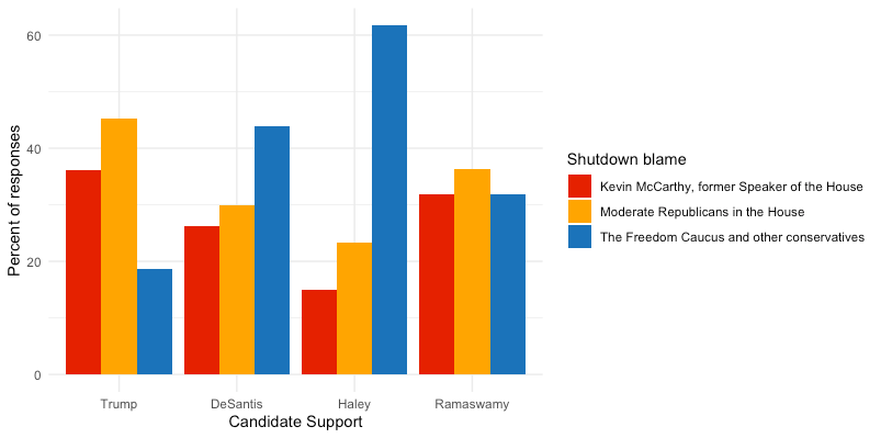 Attitudes about who would have been responsible for a government shutdown show a similar pattern. The Haley supporters overwhelmingly blame the Freedom Caucus for nearly causing a shutdown. In contrast, Trump supporters place blame mostly on moderate Republicans. Interestingly, former Speaker McCarthy does not receive the most blame from the supporters of any of the candidates.