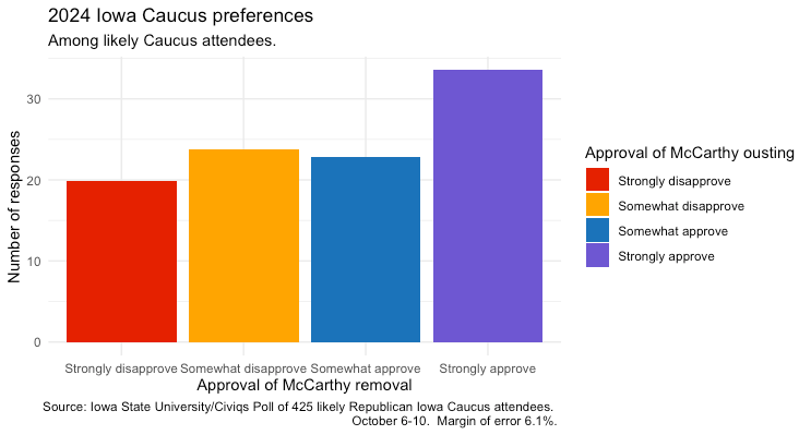 The difference between Trump and Ramaswamy supporters on the one hand and Haley and DeSantis supporters on the other is the main conclusion from these results. That said, we do want to note the difference between Haley and DeSantis supporters. In a previous Tusk post, we argued that Haley and DeSantis are drawing from different parts of the party. Haley gains support from Iowans who are opposed to Trump’s actions. DeSantis supporters, instead, couch their opposition to Trump as being about things other than Trump’s actions. In these data, DeSantis supporters also appear to be in the middle ground. They only modestly disapprove of removing McCarthy. They are more divided over blame for the near shutdown. They appear to be different from Trump supporters but are not as unified in this as Haley supporters. Again, we do not want to emphasize differences when we divide the sample into this small set of groups, but the results are consistent with our previous post.