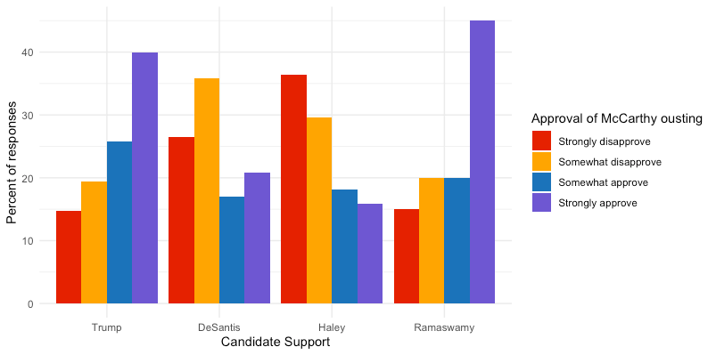 We start with the attitudes about McCarthy’s ouster. More than 40 percent of Trump and Ramaswamy supporters strongly approve of McCarthy’s removal. In contrast, the majority of DeSantis and Haley’s supporters disapprove of this outcome. It looks like the DeSantis supporters are a bit more ambivalent than the Haley supporters because they mostly disapprove not strongly. We don’t want to make too much of these differences, because we are starting to slice the data thinly here, but it does seem like the Haley supporters are the ones who are most supportive of “normal” politics in the House.