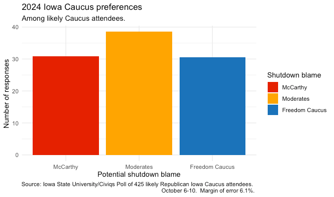 Our question about the blame for the potential shutdown focused on the House’s near inability to pass the continuing resolution. We asked the respondents, “If the Republican majority in the US House had not prevented [a government shutdown], who would you have held responsible?” We gave respondents three options: then Speaker Kevin McCarthy, the Freedom Caucus, or moderate Republicans. We were interested in the reactions of Iowa Republican caucusgoers and we didn’t want to give them the easy out of blaming congressional Democrats or President Biden.