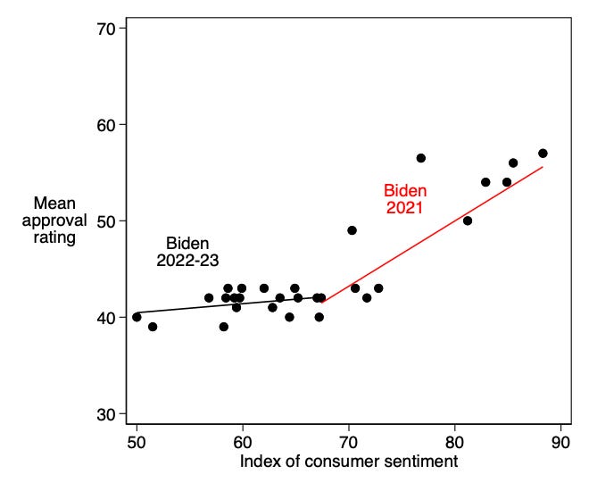 Now, interestingly, there was some relationship between the economy and approval ratings during Biden’s first year in office; both moved downward over the course of that year. But in 2022 and 2023, there actually has been some recovery of economic sentiments that hasn’t really helped Biden.