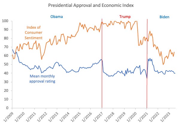 Here’s another thought: the Fed (and even Congress) have gotten pretty good at managing the economy. That is, we haven’t seen a sustained and pronounced recession since 2008. Nor have we seen an overheated boom, arguably since the 1990s. Even during Covid, the shutdown was very brief, it was quickly followed by a useful economic stimulus, and sustained economic growth returned pretty rapidly. It’s possible that extreme economic conditions could produce extreme shifts in approval, but we (luckily) haven’t seen those lately.