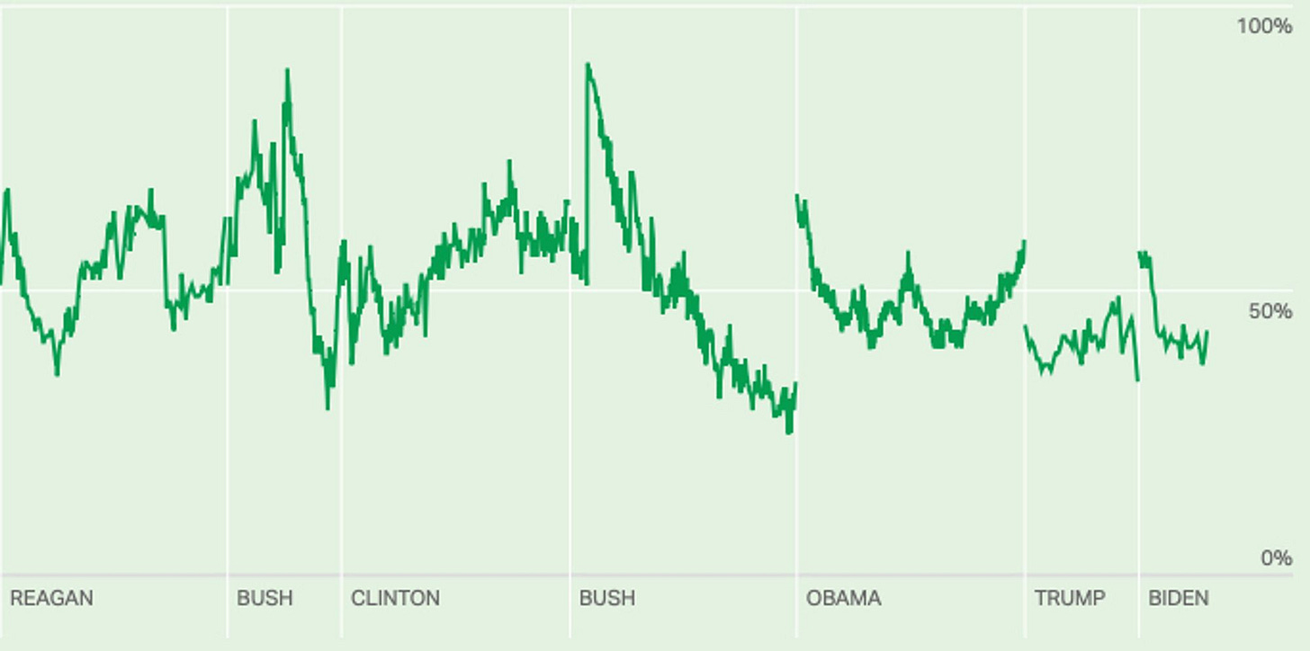 By contrast, Obama entered office with strong approval ratings, but they fell below 60 his first year in office, and no president has broken that barrier since then. Nor has any president dropped below 35 (except for Trump, who hit 34 his last month in office), while both Bushes fell into the 20s. Joe Biden came into office with approval ratings in the 50s, but those dropped following the Afghanistan withdrawal and have remained in the low 40s ever since. For the most part, the last three presidents have just had approval ratings in the 40s.