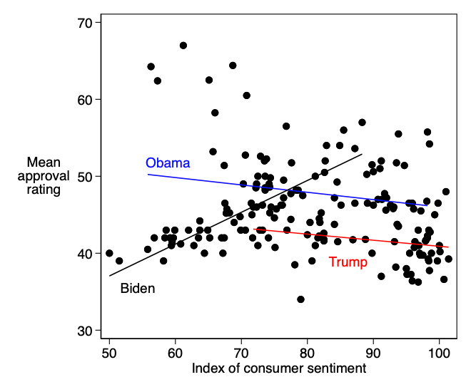 Here’s another way of looking at this, based on the analysis Sides and Griffin did. The graph below is a scatterplot of the economic index (the horizontal axis) predicting presidential approval (the vertical axis) since January of 2009. Each dot represents a month of data. We see trendlines there for Presidents Obama, Trump, and Biden. Notably, as Sides and Griffin found, the trendlines for Obama and Trump are basically flat and even slightly negative — a good economy didn’t help their approval ratings. However, we do see a positive relationship for Biden, suggesting that maybe whatever was messing things up for Obama and Trump only pertained to them.