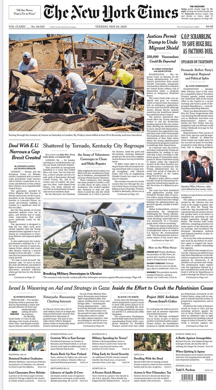 In fairness, all five papers discussed the current Republican spending bill in Congress, which is both important (affecting social safety net programs for many years to come) and dynamic (it may or may not survive a House vote this week). Other stories mentioned — the resignation of CBS News’ chief, the Supreme Court allowing Trump to end legal protections for hundreds of thousands of Venezuelan migrants, violent storms in Kentucky, etc. — are legitimately important and affect many people’s lives.