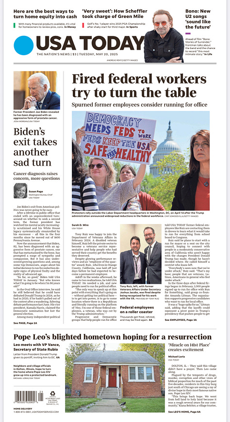 The prostate cancer diagnosis “generated more questions than answers,” said the Los Angeles Times. The Washington Post’s story was about how the diagnosis was encouraging evidence-free conspiracy theories from the right. The Wall Street Journal’s article (not on the front page) refers to “continued questions about the former president’s cognitive abilities in office.” Yet it quotes just one Democrat arguing that the party should nominate people for president who are under retirement age (which it did last year) and one who is angry at the Biden White House. It also quotes Vice President J.D. Vance. The New York Times’ story (also not front page) quoted just one former Democratic elected official (Dean Phillips, who challenged Biden for the nomination last year), and also quoted oncologist Ezekiel Emanuel (Rahm’s brother), who claims that Biden “did not develop [prostate cancer] in the last 100 to 200 days. He had it while he was president. He probably had it at the start of his presidency in 2021.” And hey, he’s the oncologist, but I’m guessing he’s examined Biden as many times as I have.
