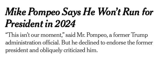 But he’s also spent two years talking to the sorts of people whose support he’d need to take down former President Trump, or at least be a credible alternative. And it seems pretty clear that those folks weren’t prepared to join his effort. They saw no need to fund him or endorse him, and perhaps they saw a risk in doing so. When Pompeo says “This isn’t our moment,” he means that he needs a certain amount of backing to go forward this year, and it just isn’t there for him.