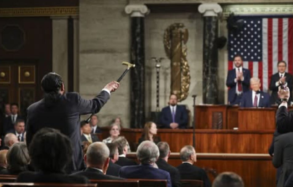 The behavior of Democrats in Washington in response to the Trump administration’s actions continues to befuddle. Clearly some of them recognize the gravity of a presidential administration that defies laws and the Constitution, terminates government spending that has already been appropriated and employees who have worked responsibly, builds concentration camps for migrants, and tosses democratic allies overboard in favor of their authoritarian invaders. But also clearly many do not. This resulted in a disjointed set of responses to Trump’s address to the joint session of Congress this week, in which some Democrats boycotted, one stood to object and was forcibly removed, many wore pink and held up small auction paddles, and some just sat and looked grumpy, while Rep. Elissa Slotkin (D-MI) gave a formal speech praising Ronald Reagan. It was hard to believe that this was the same party that, just eight months ago, pushed a president off the ticket and coordinated behind Kamala Harris in a matter of hours to increase their chances of winning an election.