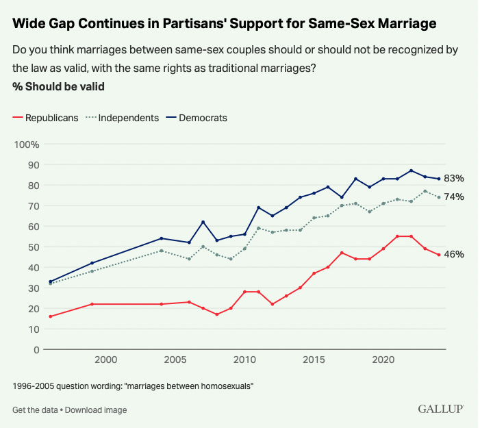 Gallup data show that, while acceptance of same-sex marriage is basically still at an all-time high, Republicans have shifted away from it in recent years.
