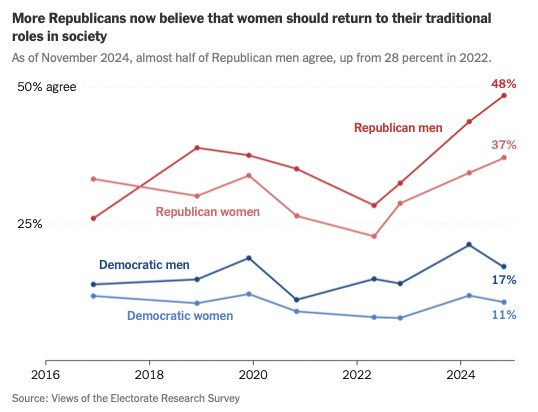 The point here is that partisan shifts like this don’t just happen. Most people don’t follow politics very closely, but they do respond to signals from elites about how to think about issues. The polling shifts are the results of Republicans operating in a very different media environment from Democrats, being exposed to news, social media, TV shows, politicians’ speeches, and other things that have begun portraying same-sex couples and working women in a more negative light than they used to, while embracing the mythical tradwife.