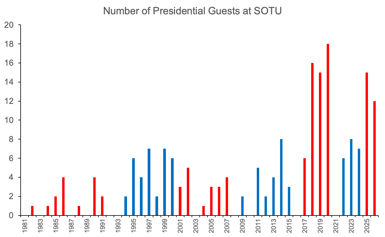 The figure below shows the number of guests presidents have had in person during their State of the Union Addresses since 1981. The data through 2024 come from UCSB’s American Presidency Project. I assembled the most recent two years from news coverage. (I am counting the hockey team as one guest, rather than counting each team member.)