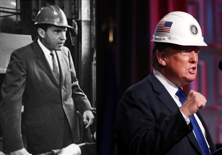 Nixon, who had won the 1968 popular vote by less than one percentage point, was desperate to improve his odds for reelection. He saw white laborers, bothered by the Democratic Party’s leftward turn, as a promising source of votes. The “Hard Hat Riot” of 1970, in which hundreds of New York City construction workers formed a counter-rally to a Vietnam War protest and beat up anti-war demonstrators in the streets, told Nixon that at least some of these folks were open to his appeals, and Nixon leaned in on championing these hardhats as patriots and exemplars of the Silent Majority. Nixon invited some of the hardhat protesters to the White House and received a commemorative pin from them.