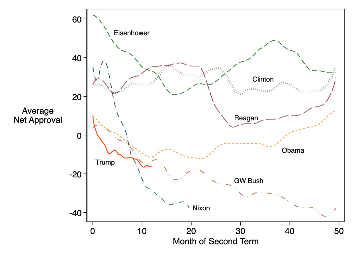 G. Elliott Morris was kind enough to share his data with me, and I used those to compare Trump’s current (second-term) net approval ratings against those of other second-term presidents. Here’s a figure showing them all.