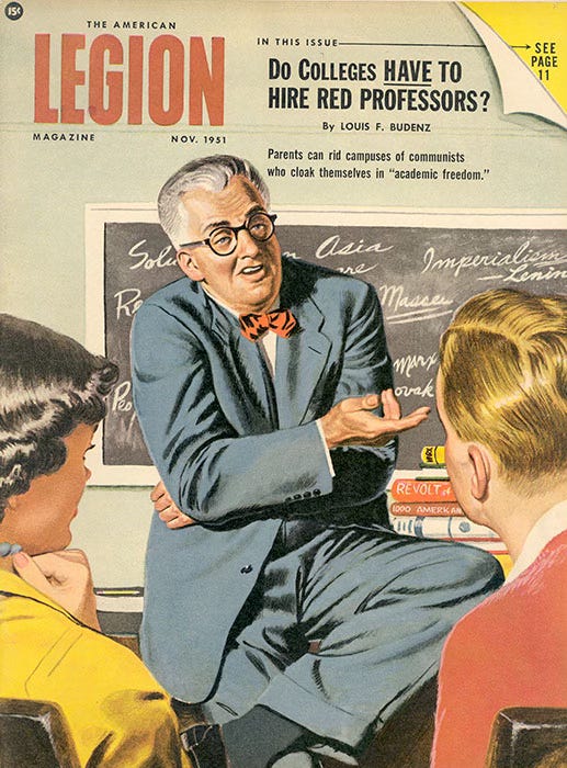 This kind of rhetoric supported the Red Scare against colleges and universities in the 1950s, leading to demands of loyalty oaths from faculty, restrictions on research funding, FBI investigations of professors, and more, all in the name of stopping communism. And notably, you can hear a lot of these arguments in modern conservative attacks on higher education.