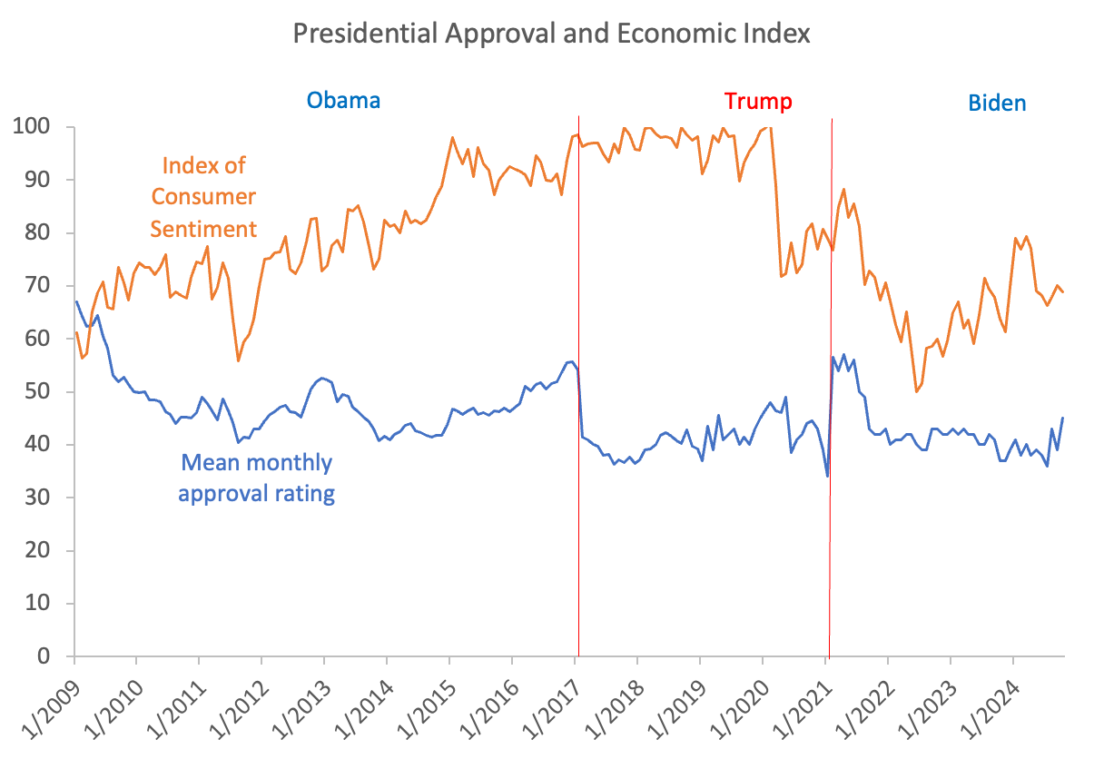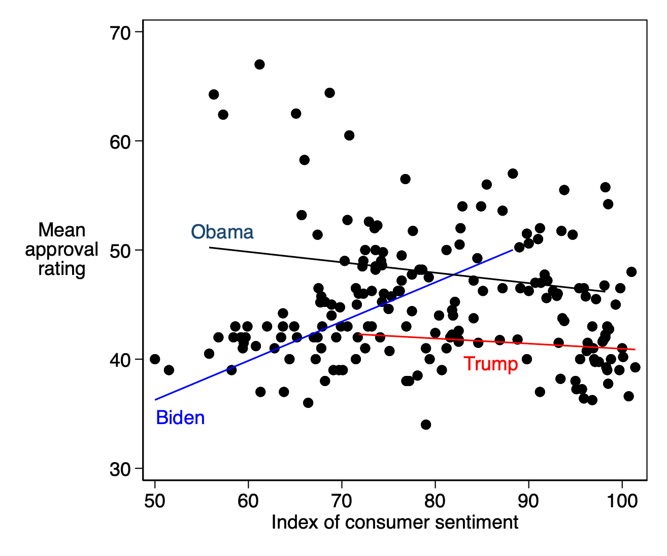 But more importantly, the approval ratings in the figure above appear unrelated to variations in the economic index. During the Obama presidency, the economy was strongest toward the end, but he was at his most popular at the beginning. Trump’s economic figures were strong until the Covid crash, but that barely budged his approval ratings. Biden presided over a drop in economic sentiment and in approval ratings, but the economic recovery since then hasn’t really buoyed his numbers.