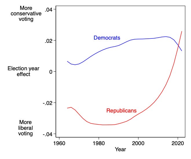 Now, we know that senators’ constituents are hardly the same today that they were in the 2010s, no less the 1960s. So some of the results above could be due to the fact that Republicans are representing very different sorts of voters than Democrats are. To try to sort this out, I ran a regression equation to predict the election-year effect on senators controlling for the vote in their state in the most recent presidential election. The graph below shows the election-year effect by party.