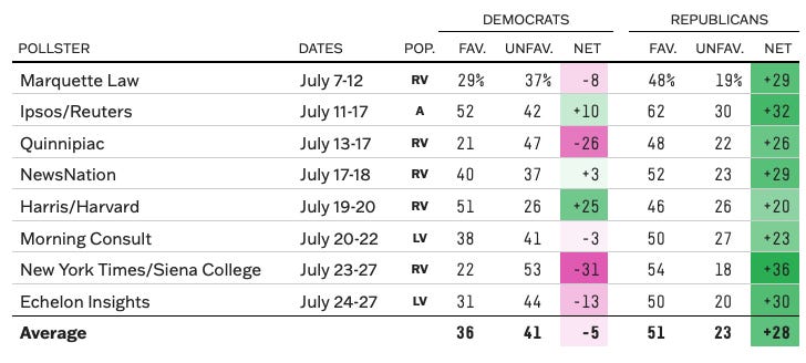 As Nathaniel Rakich demonstrated at FiveThirtyEight, Kennedy is far more highly thought of by Republicans than by Democrats. (I can confirm that a number of local Republican leaders I’ve interviewed have expressed serious interest in Kennedy.) This collection of polls from July shows that his net favorability was, on average, around 25 to 30 points among Republicans, but varied wildly among Democrats and averaged to -5.